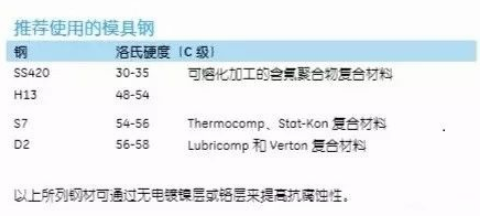 要根据应用需求选择适当的模具钢。如果是原型制作,则无需使用硬化模具钢。大多数情况下,通常使用预硬化钢或铝来降低成 本,以及便于在原型制作阶段对模具进行调整。这些软性金属还可以模塑出足够的试件及预制部件。预硬化的模具钢(如 P-20 或 NAKR-55)常用于制作大规模的模具,因为在大型应用中进行模具钢硬化是很不切实际的。