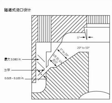 使用常规模具时,热材料经过注道衬套进入模具。流道系统引 导材料经由浇口进入模腔。要使熔体分布适当和正确顶出成 型部件,注道衬套的正确设计和适当尺寸是至关重要的。注 道“O”直径应该比喷嘴出口直径约大于 20%,以防模具开启时注 道阻塞。注道尺寸示意图如下所示。“O”尺寸还与部件和流道大 小密切相关。可以使用加热的注道衬套取代常规注道衬套。加热注道(或 叫“热”衬套)的初始成本可能比“冷”衬套高,但由于它消除了连 在每个部件或流道系统上的注道,因此可极大地减少产生的废 弃物。有了热衬套,对进入流道系统的熔体温度的控制就能更加精确。
